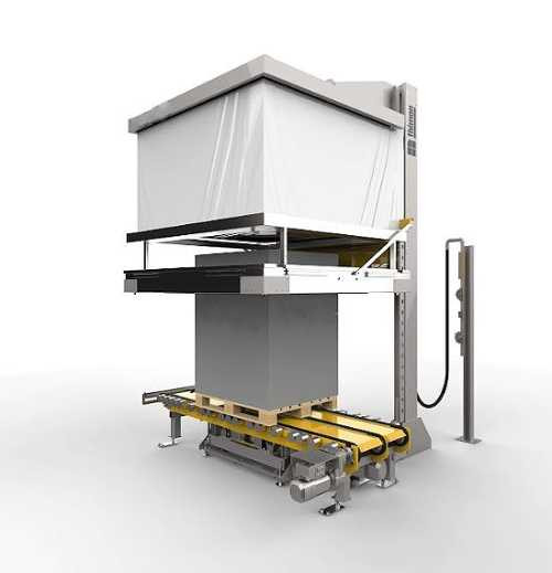 Capable de traiter jusqu'à 180 demies palettes par heure, cette machine offre une solution rapide et efficace pour emballer les palettes avec une couverture complète des produits, les protégeant ainsi contre les intempéries, les chocs et la poussière.