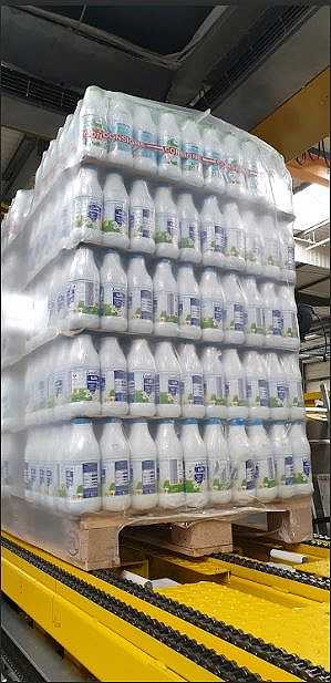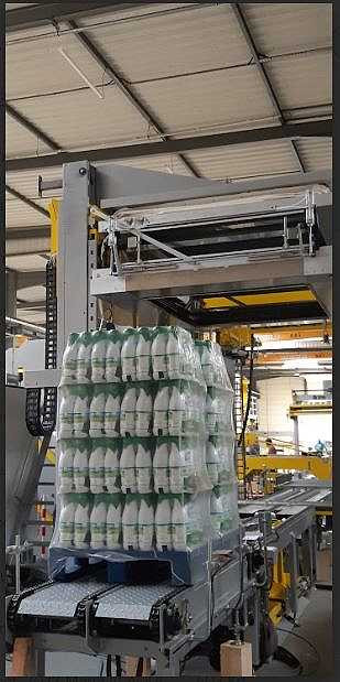 La machine utilise un système d'emballage avec film rétractable par air chaud , garantissant une protection complète et uniforme des produits sur chaque palette.
