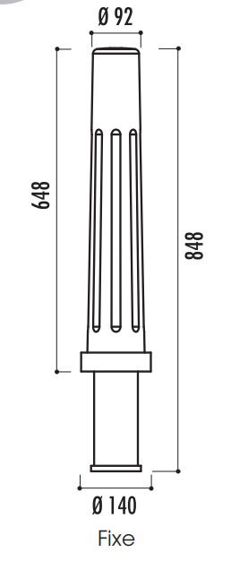 Fonte, finition peinture noire Hauteur totale : 848 mm Hauteur hors sol : 648 mm Diamètre : Ø 92 mm Par scellement ou amovible avec boîtier (option)
