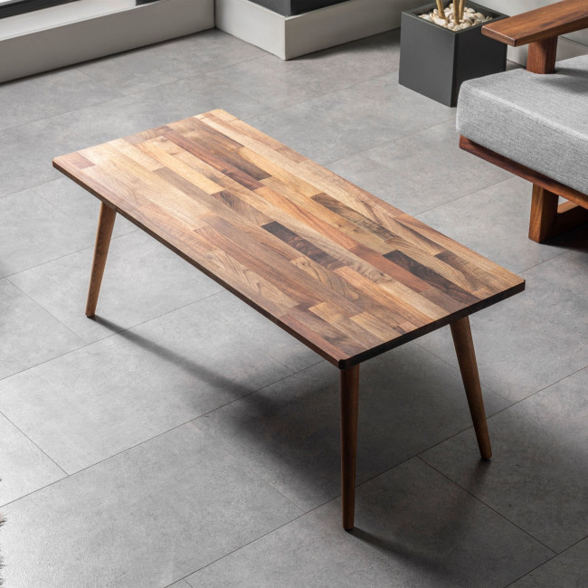 Traitée avec un produit de préservation du bois de qualité supérieure, respectueux de l'environnement et sécurisé pour le contact alimentaire, la surface de la table basse conserve son aspect naturel tout en étant protégée contre les éléments tels que la chaleur, la lumière et l'humidité.
