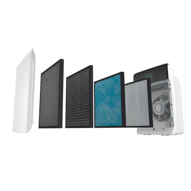 - Les particules fines & micro-organismes de taille supérieure à 0.3 microns sont filtrés à 99.95% par l’action combinée du filtre antibactérien et du filtre HEPA H13