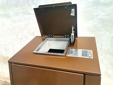 La trappe du cache bacs est fabriquée en tôle galvanisée de 2 mm d'épaisseur, offrant une finition poli miroir ou une couleur au choix grâce à la peinture électrostatique.