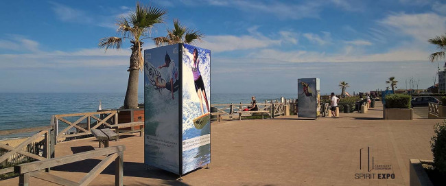 Notre association, Deep Blue Exploration, organise une exposition photographique itinérante destinée sur Mayotte, dont une partie des lieux d"exposition se trouve à l"extérieur (sur gravier stabilisé) et exposé au vent. L"autre partie se trouve en intérieur (ex: hall aéroport).