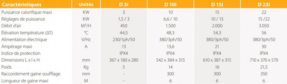 Notre chauffage peut être utilisé en soufflage direct ou être raccordés à une gaine de soufflage (diamètre 300 mm pour D 10i et D 15i, diamètre 350 mm pour D 22i).