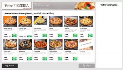 L'interface tactile de 32 pouces affiche clairement les pizzas disponibles et permet une navigation fluide. Les clients peuvent passer commande rapidement en quelques clics.