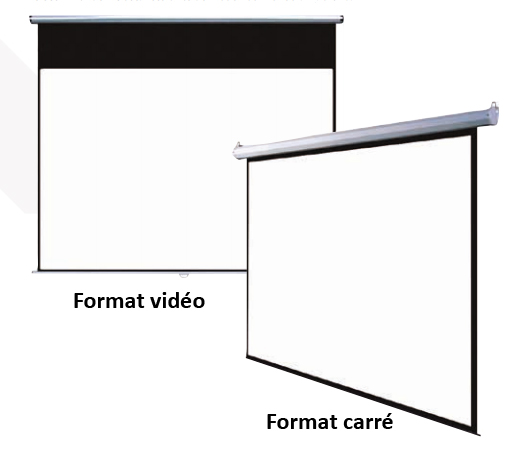 - Toile classée au feu M1 : blanc mat avec bordures noirs - Possibilité de fixation au mur ou au plafond. 2 formats carré ou vidéo 4:3.