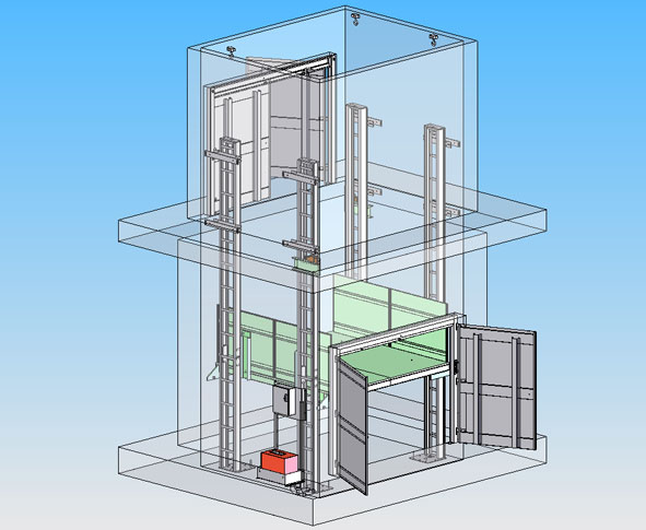 Monte-charge Vitrier, type que SNCF Part-Dieu à Lyon pour accueillir une palette, 1 tonne avec son transpalettes et son conducteur ou des passagers, dont handicapé dénivellement 3 m. Entrée donc côté sortie de l’autre.