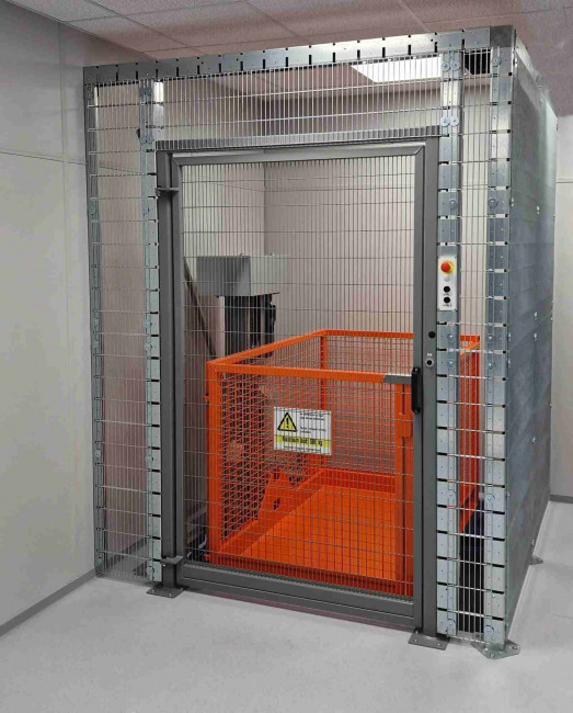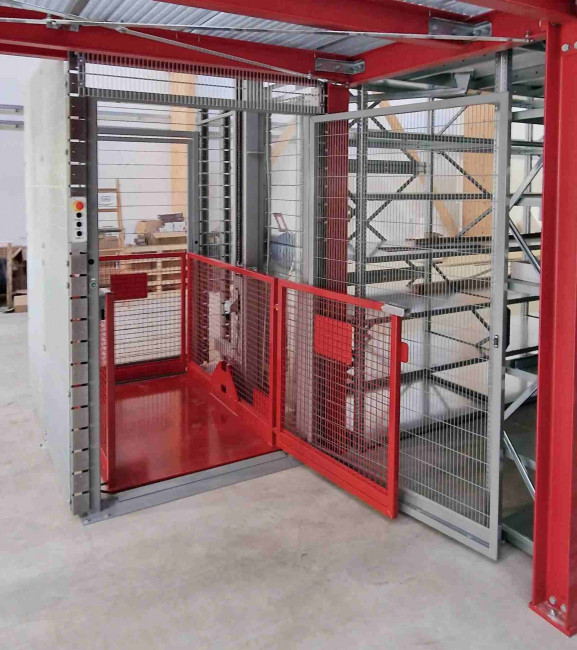La cage de levage dispose d’un plancher plat avec rampe intégrée côté chargement, évitant toute fouille au sol et facilitant l’accès.