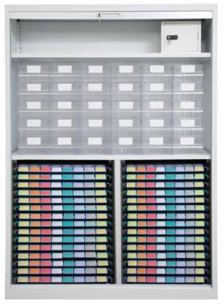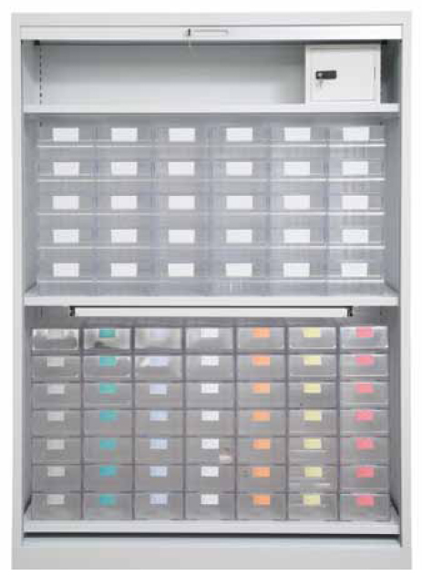 1 armoire à medicaments ref/15263375 14 bacs tiroirs H 70mm 31 bacs tiroirs H 110mm + étiquettes + protège étiquettes + tablettes