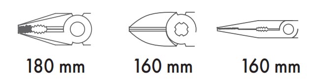 Avec sa composition universelle – pince universelle 180 mm, pince coupante 160 mm, pince à bec long 160 mm – ce pack de pinces inox s’adresse à un large panel de métiers :