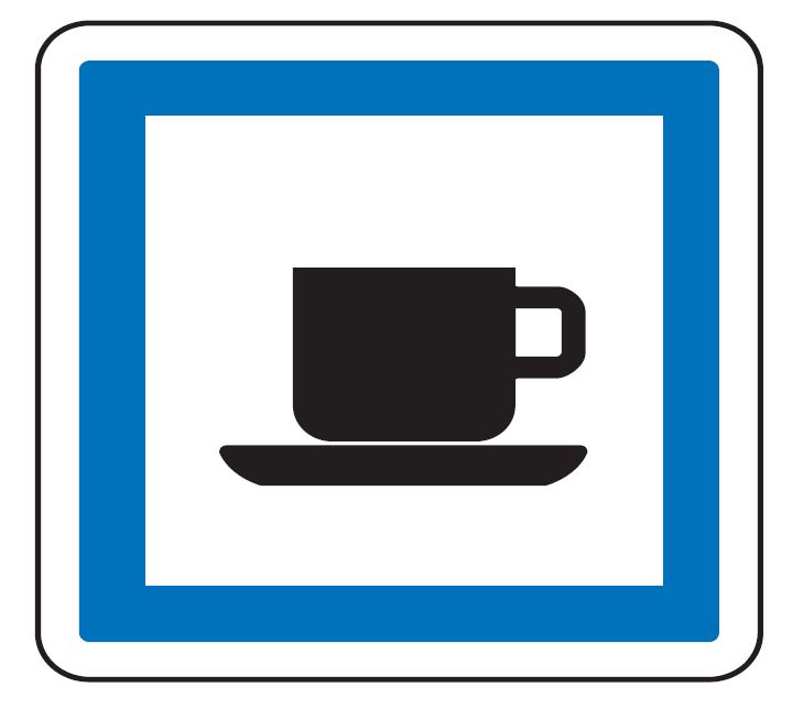 Le panneau de type CE18 est employé en France pour indiquer une cafétéria située sur une aire d'autoroute ou de route à chaussées séparées sans accès riverains.
