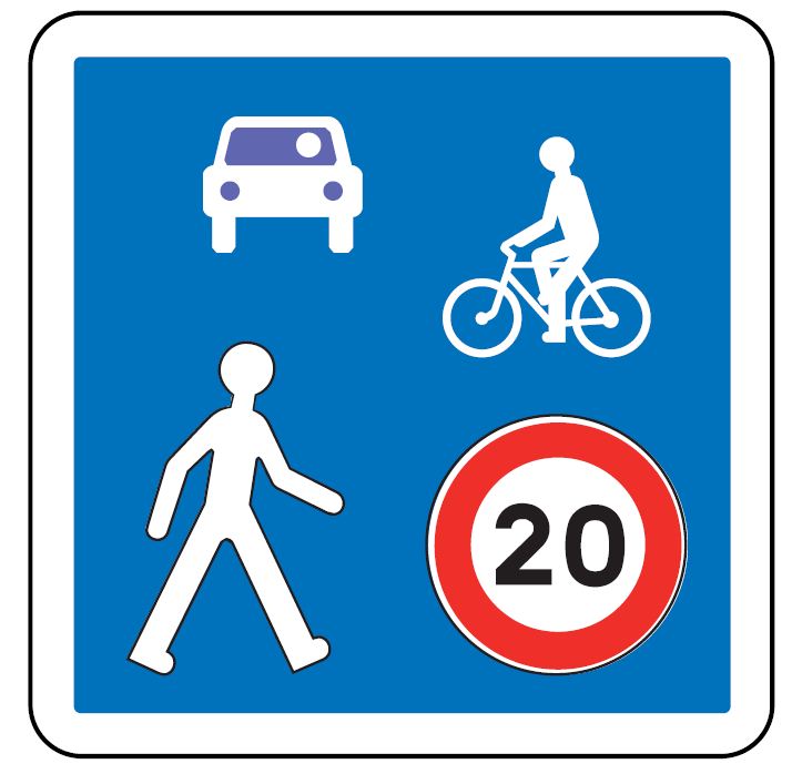 Notre panneau prescrit dans toute la zone l'interdiction de dépasser les 20 km/h, la priorité générale des piétons sur les véhicules et le stationnement interdit hors emplacements signalés comme tels.