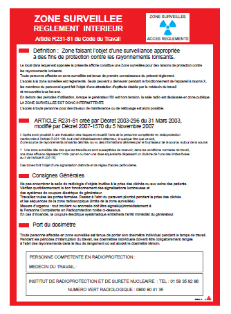 Ce consigne radiologie est imprimée et plastifier. il est disponibles on deux modèles, un pour les zones contrôlées et l'autre pour les zones surveillées.