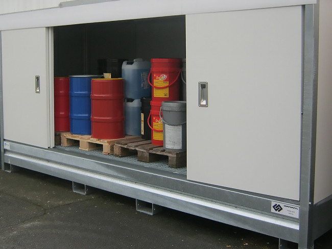 - Plateformes, abris, box, bungalows, conteneurs de stockage et armoires de sécurité avec rétention