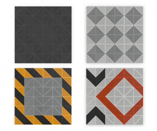 Pour la 1ère fois, les dalles sont en format Triangulaire. Pourquoi ? Parce que cela permet de créer des marquages au sol totalement inédits. Flèches, Zébra, ou simplement dans un but esthétique, les triangles assemblés créent un rendu magnifique et fonctionnel !