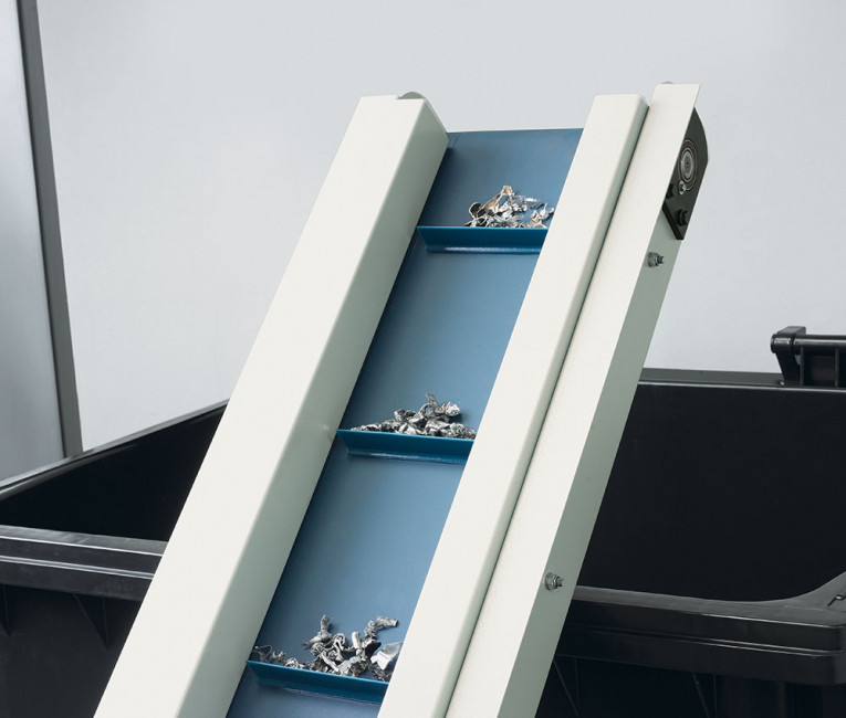 - Le matériel détruit est transporté par un tapis convoyeur et peut être collecté dans toutes sortes de conteneurs classiques séparés
