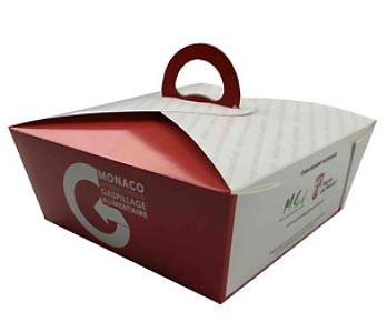 - Disposant de poignées de transport, cet emballage recyclable est spécifique à la vente à emporter.