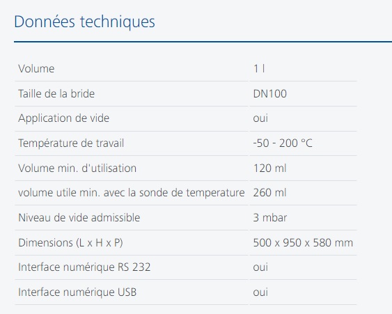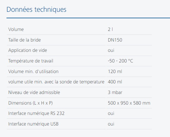 Grâce à la qualité exceptionnelle des matériaux utilisés, ce réacteur peut fonctionner dans une large plage de températures, allant de -30 °C à 200 °C, et maintenir un vide de 3 mbar.