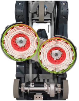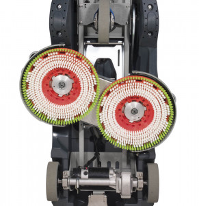 Cette configuration à double brosse offre un équilibre optimal entre pression au sol, enlevage de saletés et maniabilité sur zones encombrées, avec marche avant/arrière pour des reprises de bandes efficaces.
