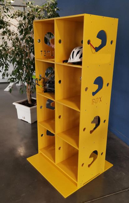Grâce à son design robuste et modulable, ce meuble rangement casque trottinette s’intègre facilement dans les espaces intérieurs tels que halls d’accueil, parkings à trottinettes ou locaux dédiés à la mobilité douce.