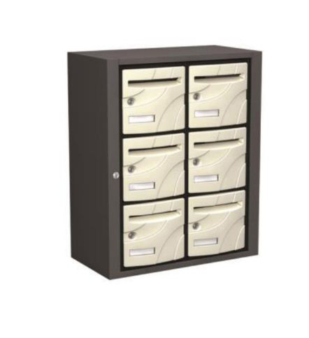 Bloc boites aux lettres 6U 3 horizontales / 2 verticales couleur beige pose intérieures contre un mur