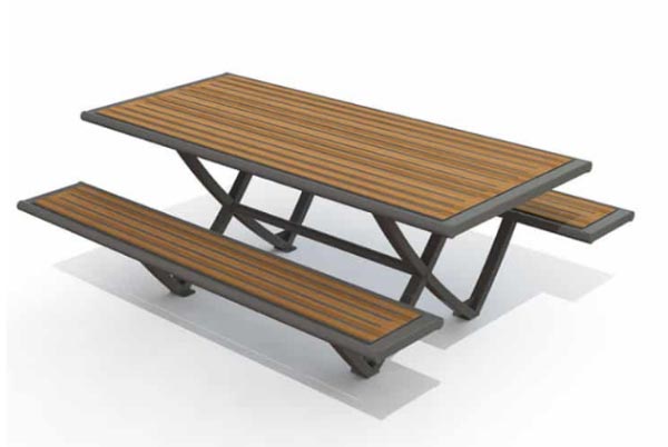 À assise et plan de table en stratifié compact, imitant le bois, c'est un mobilier urbain qui s'intègre dans n'importe quel espace naturel.