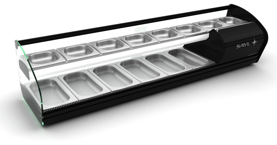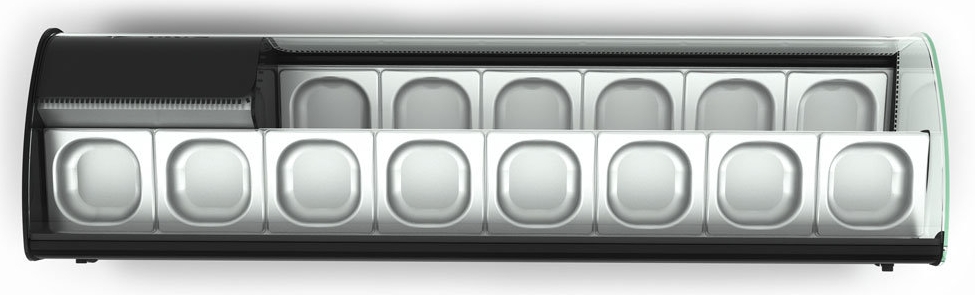 vitrine réfrigérée en inox dispose de deux niveaux d'exposition offrant une capacité de 8 bacs GN 1/6 et 6 bacs GN 1/3 x 40mm.