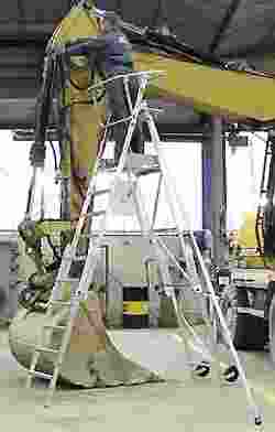 Disposant d’un garde-corps rabattable, ce matériel de manutention peut être déplacé facilement grâce à ses roues.