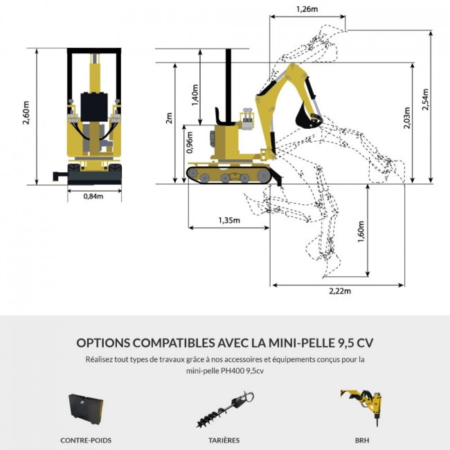 Sa force d’arrachement d’1,6 tonne et sa polyvalence vous permettront de réaliser tous types de travaux d’aménagement et d’entretien de terrain pour les particuliers et semi-professionnels.