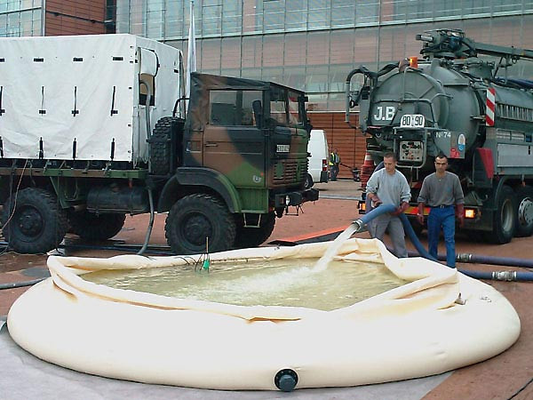 - Défense et Aide humanitaire : cuve de stockage d’eau potable avant distribution, bassin de décantation sur unité de traitement.