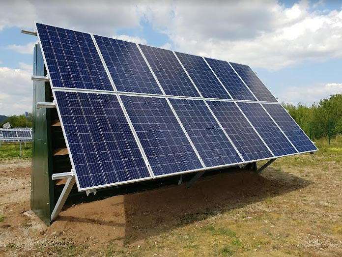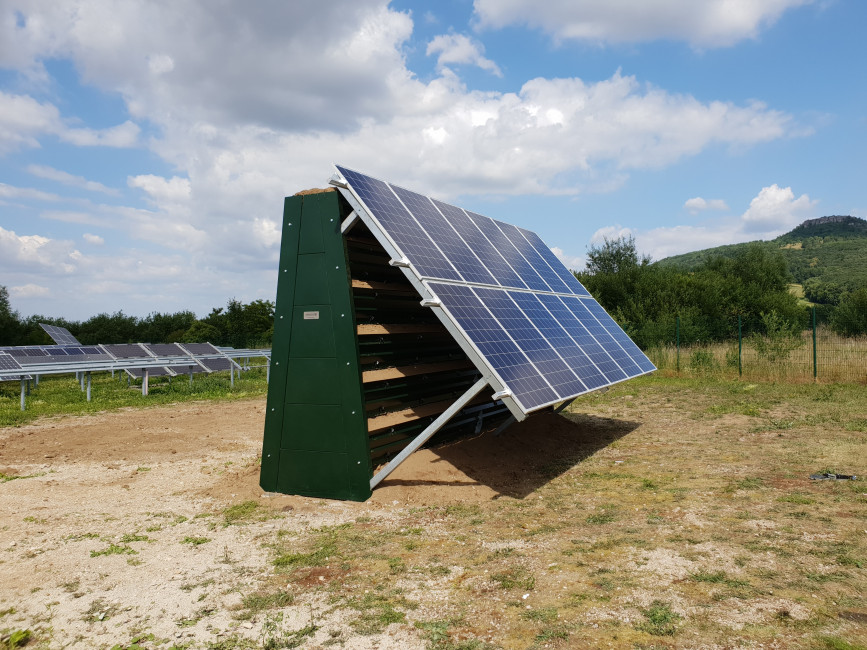 Réalisée sur mesure, cette ossature supporte à la fois les plantes et les panneaux solaires.