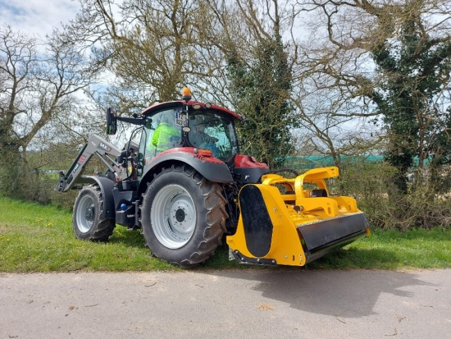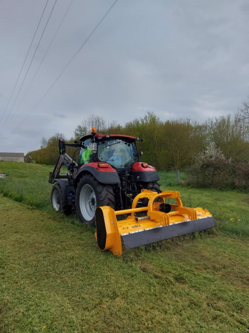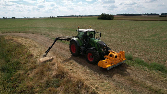 Ce type de broyeur propose un déport hydraulique de 2 x25 cm et un entrainement de 540 tr/min de série avec possibilité de changement à 1000 tr/min. Des chaines de protection ont été placé à l’avant, un volet en caoutchouc à l’arrière et des patins d'usure sont fixés sur les deux côtés pour protéger le bas du caisson au contact de la végétation ou du sol.