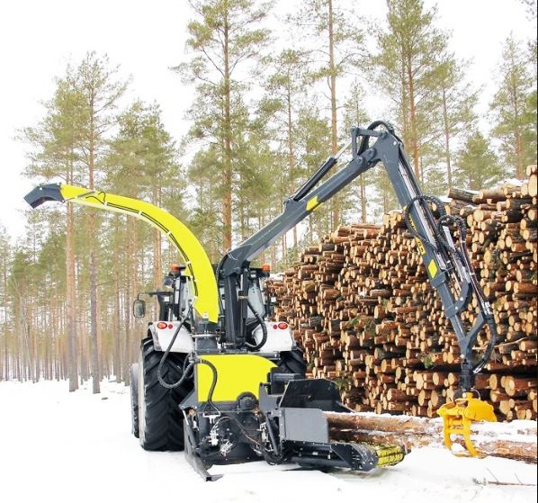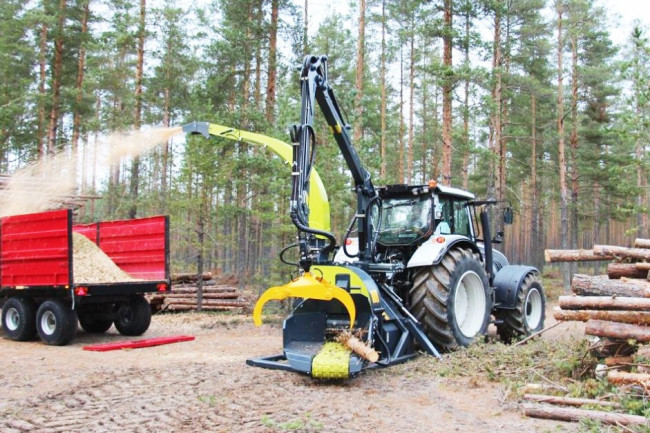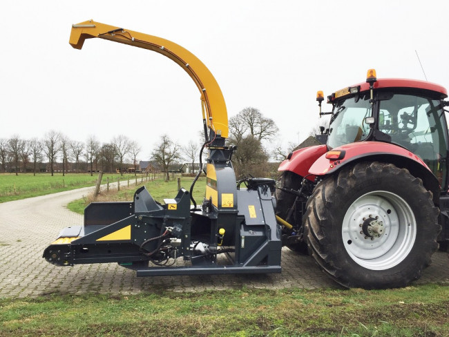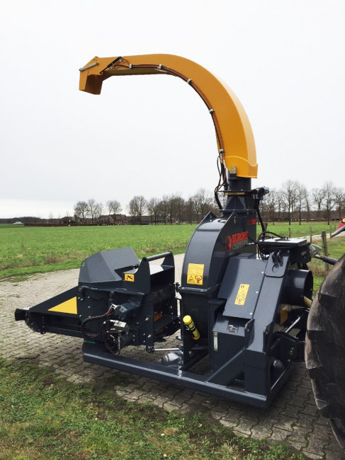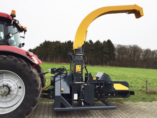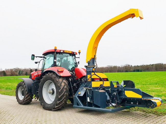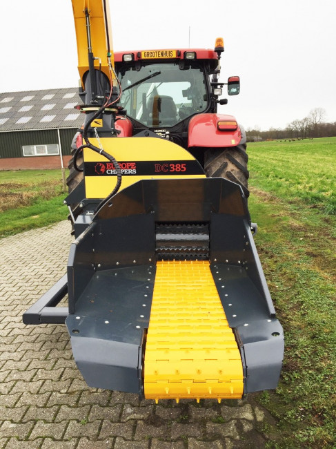 Ce broyeur à plaquettes Europe Chippers DC385 est entraîné par la prise de force d’un tracteur jusqu’à 255 CV.