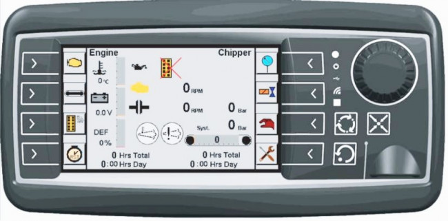 - Cabine LUXE incluant radio CD, air climatisé, chauffage, essuie glace, siège, display de contrôle du chipper, système élévateur de cabine 1200 mm, 3 phares de travail, 2 pédales + 2 manettes joystick
