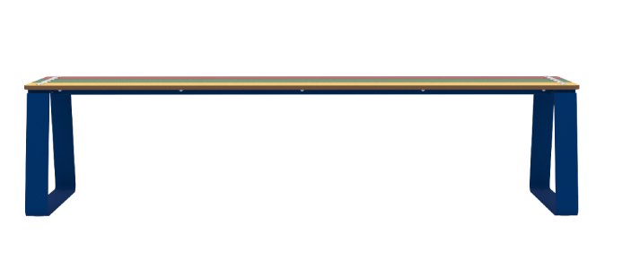 La banquette extérieure pour enfants est proposée en version multicolore : lames ROUGE, VERT, JAUNE, associées à des pieds métal BLEU RAL 5017.