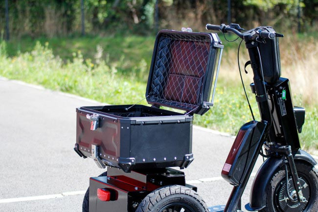 La Black box : un caisson résistant capable de transporter jusqu'à 50 kg ou 150 litres. Le Top case : une caisse modulable capable de transporter jusqu'à 100 litres.