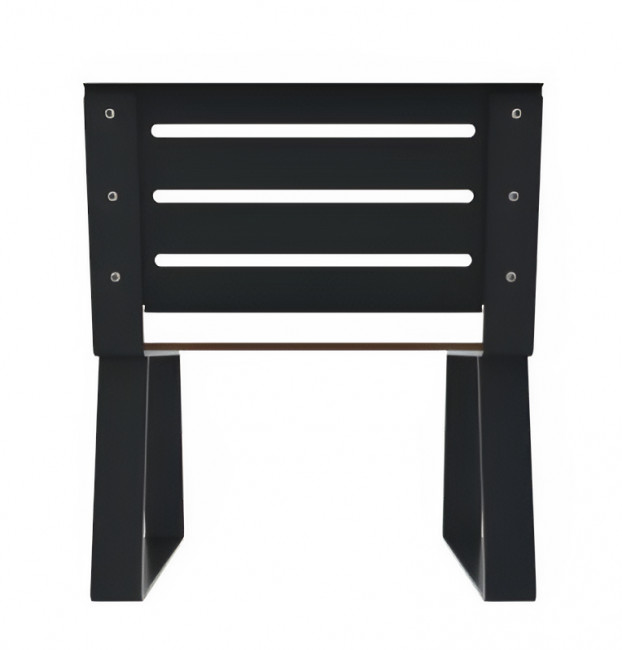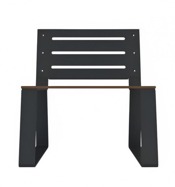 Le mélange de matières entre la structure en acier finition ajourée et l’assise en compact HPL effet lames donne à ce banc en acier et compact HPL une identité visuelle moderne.