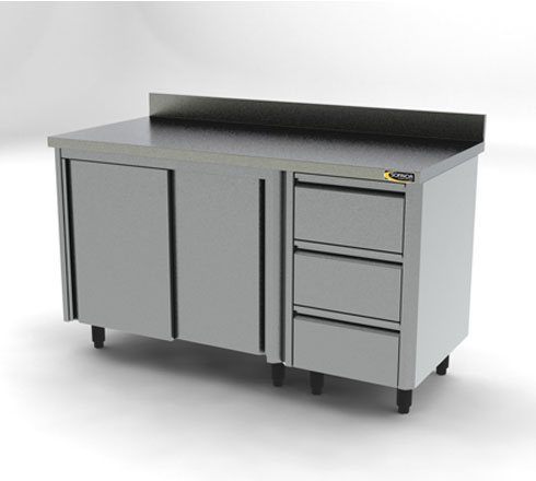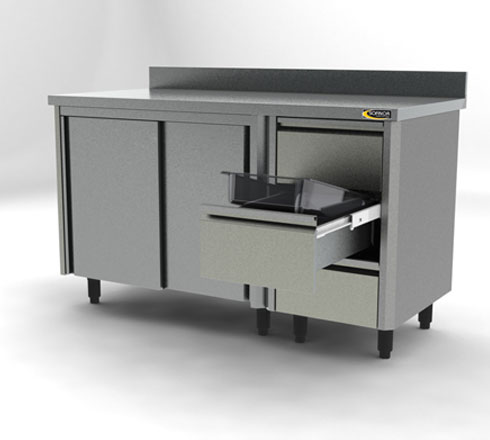 meuble bas qui se compose de 2 portes coulissantes et 3 tiroirs pour bacs gastros.