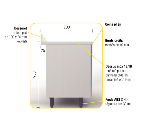 Muni d’un dessus à bords rayonnées avec dosseret arrière d’une longueur de 1000 ou 2000 mm (selon modèle).