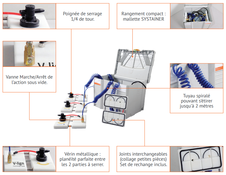 - Version MOBILE incluant 4 étriers de jointure et une pompe à vide électrique.