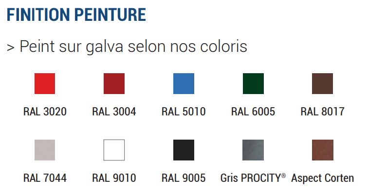 Acier peint sur galva selon nos coloris - Gris Procity - Blanc pur - RAL 9010 - Bleu gentiane - RAL 5010 - Rouge signalisation - RAL 3020 - Noir foncé - RAL 9005 - Gris soie - RAL 7044 - Rouge pourpre - RAL 3004 - Vert mouse - RAL 6005 - Brun chocolat - RAL 8017 - Aspect Corten D'autre RAL sont disponibles sur demande
