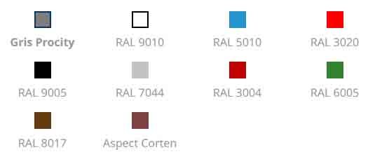 Votre mobilier urbain transport se personnalise selon vos besoins spécifiques. Notre gamme de coloris inclut les teintes RAL classiques (8017, 6005, 5010, 3004, 3020, 9005, 9010, 7044), l'aspect Corten tendance et notre exclusif Gris PROCITY®.