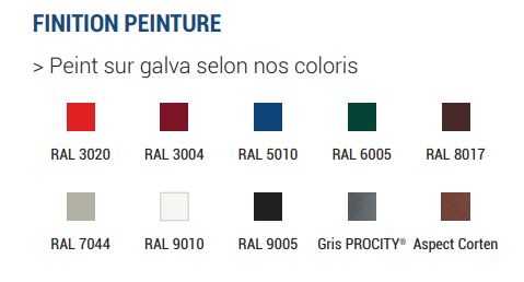 La peinture sur galva multitude de finitions RAL garantie une adaptation parfaite à votre environnement urbain : marron, vert, bleu, rouge, blanc, gris, aspect corten…