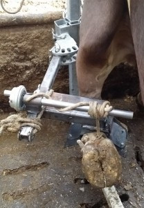 Cette cage de parage vache laitière est une cage mobile sur roues se déplaçant à la main pour être positionnée autour de la vache prise au cornadi.