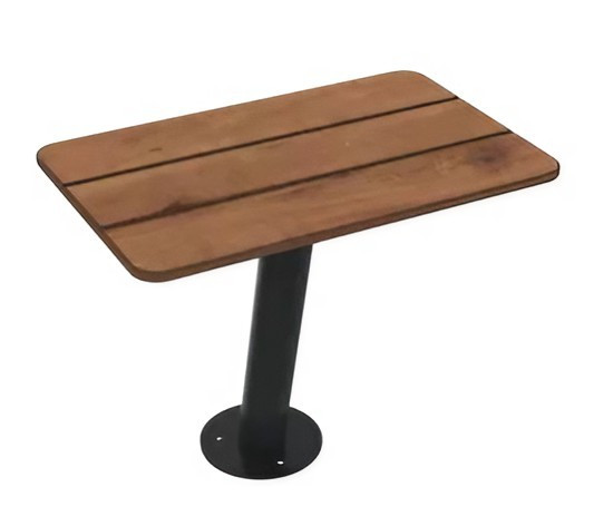 Le compact HPL finition effet lames et ses coloris bois chêne clair, pin Tyrol ou teck apportent une touche chaleureuse à cette banquette urbaine en acier.