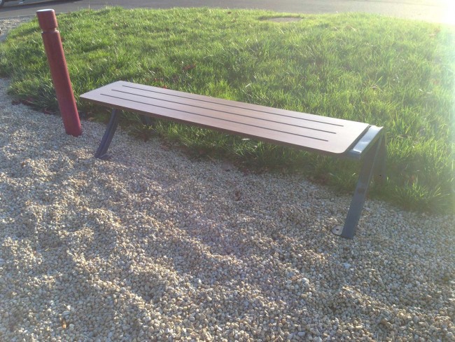 Cette banquette publique en stratifié compact aspect teck repose sur une structure en acier galvanisé (anticorrosion).