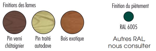 La structure repose sur un piètement en acier, finition peinture au four coloris RAL 6005 vert mousse, garantissant une excellente résistance à la corrosion et aux agressions extérieures.