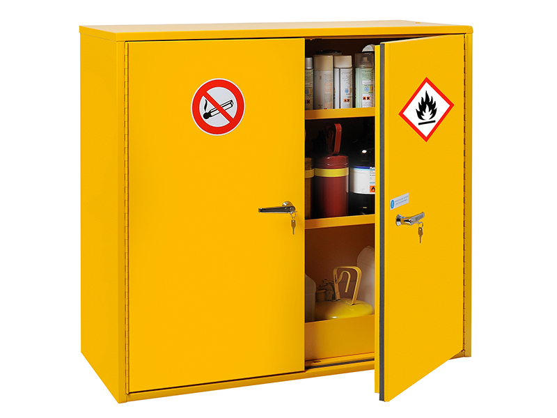 Armoire de sécurité pour produits inflammables double paroi isolée avec rétention et fermeture automatique.