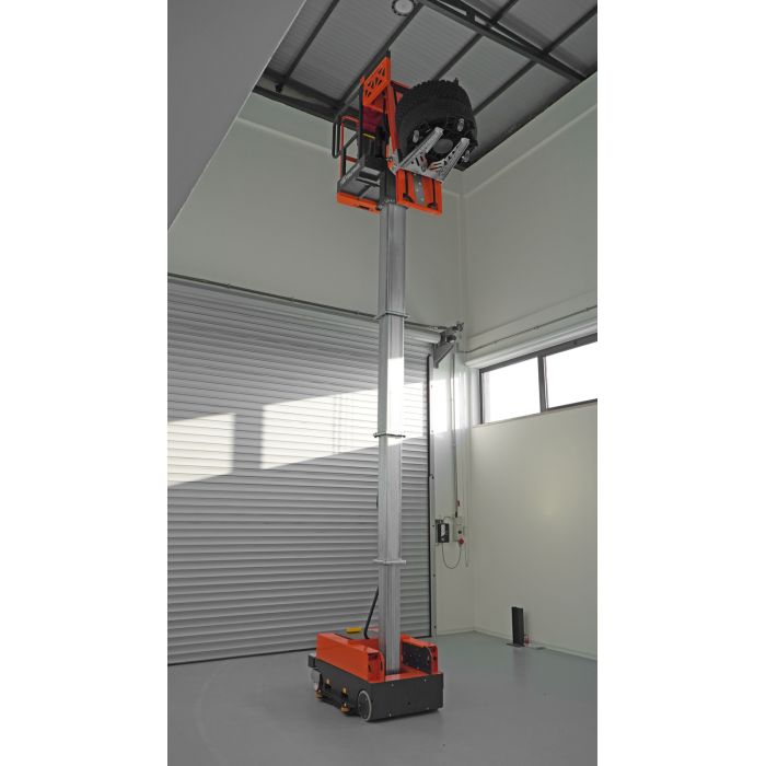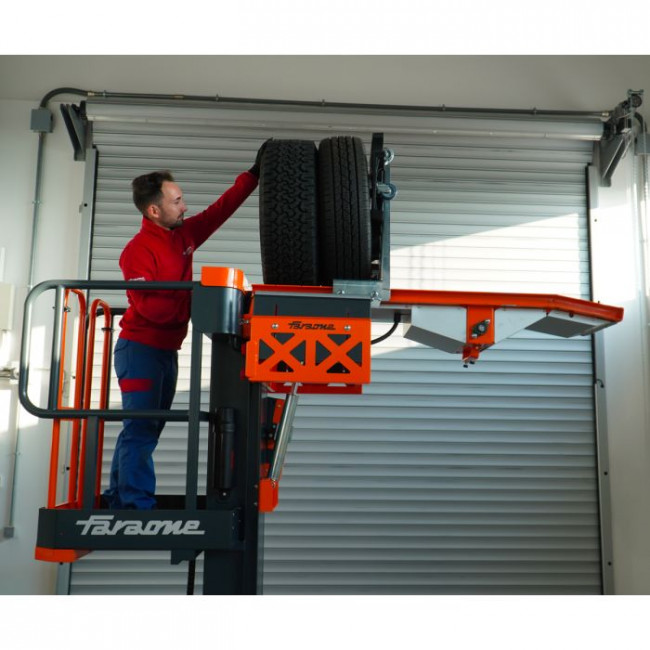Avec une hauteur de travail maximale de 7,6 m, une charge totale de 300 kg et une plateforme réglable électriquement jusqu’à 180 kg, il permet de placer rapidement les pneus directement sur les étagères, accélérant vos opérations.