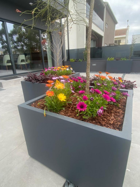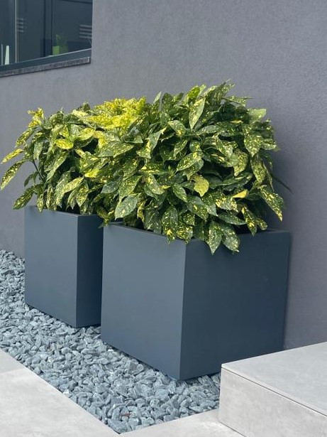 J"aimerais avoir un devis pour deux jardinières rectangulaires en béton pour une entrée extérieure d"entreprise. Faites vous seulement les jardinières ou un aménagement avec des plantes ?